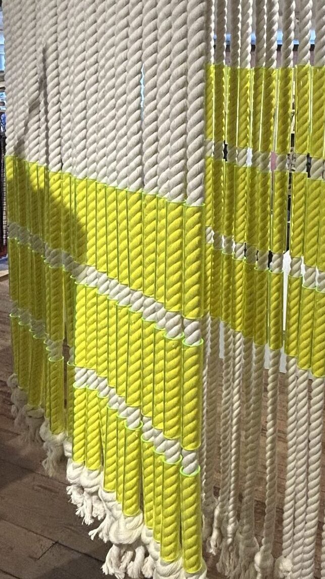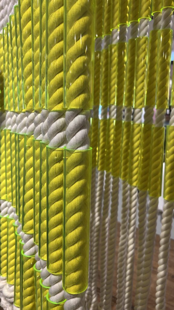 Repurposed materials were used throughout, combining natural rope with bright acrylic accents to achieve a balance of texture, transparency, and color contrast.