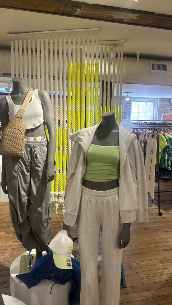 A large hanging curtain installation made from thick rope and repurposed acrylic chimes, designed to subtly conceal the sale section while maintaining light flow and visual interest.