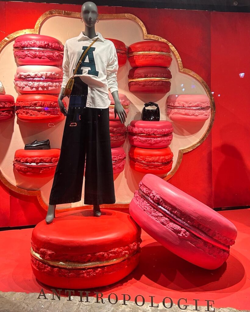 A window display inspired by a French café, featuring oversized macaroons in red, bright pink, light pink, and metallic tones arranged in a playful, sculptural composition.
