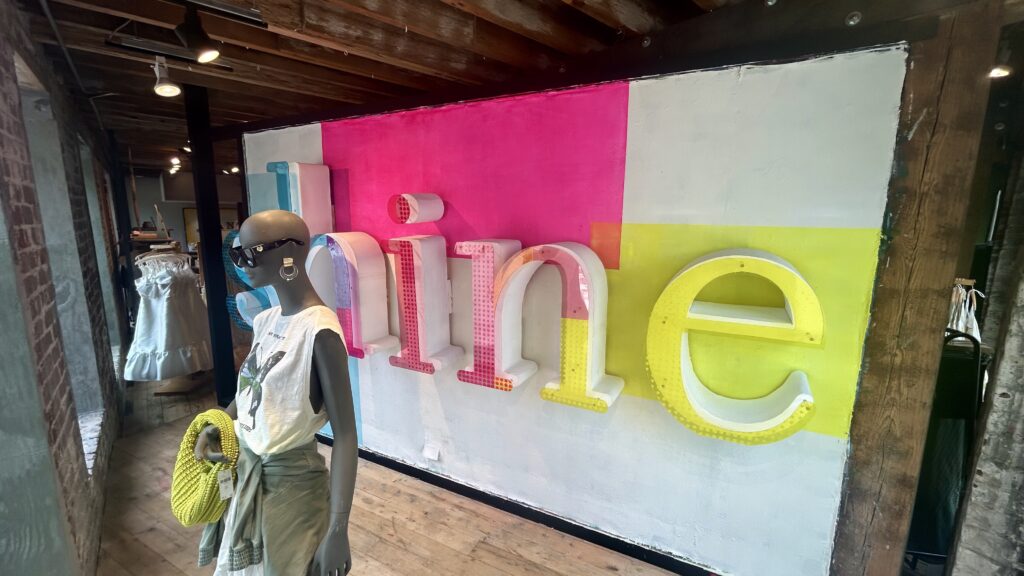 A custom lettering display featuring handbuilt letter frames topped with acrylic faces. The design combines structure and transparency to create a bold, dimensional expression of the brand.