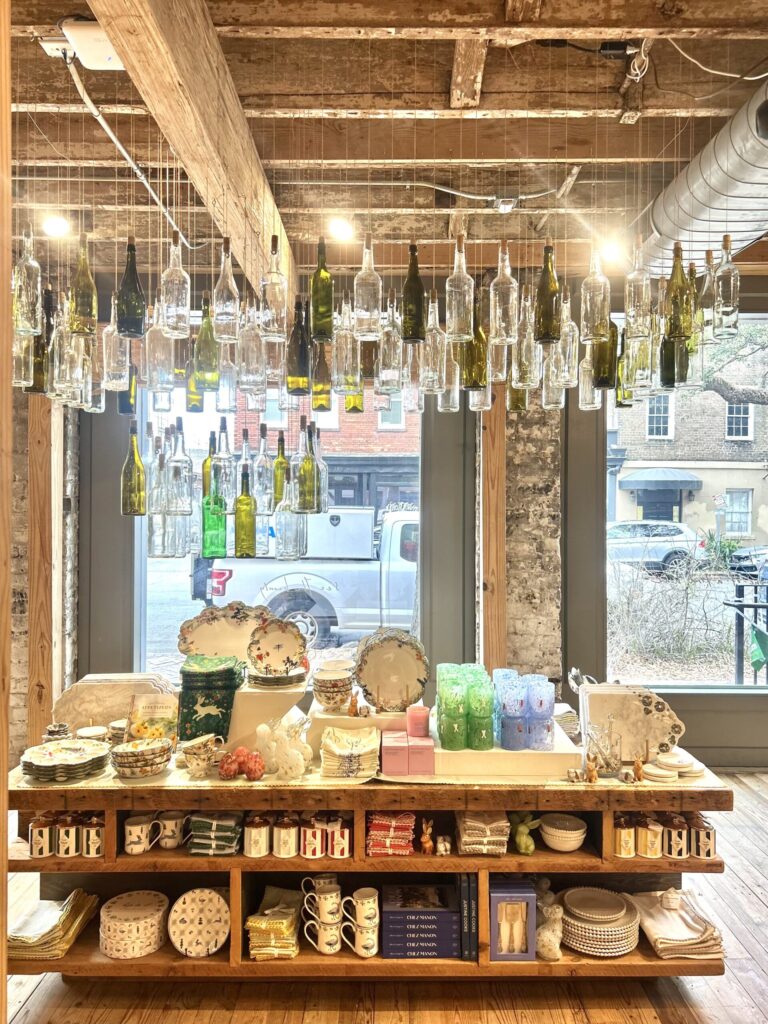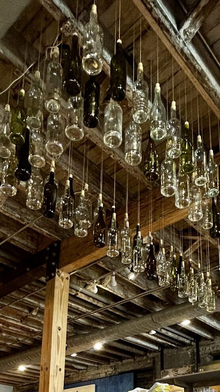 An upcycled wine bottle chandelier that highlights the brand’s commitment to creativity and sustainability, transforming discarded materials into a meaningful statement about responsible design and mindful living.