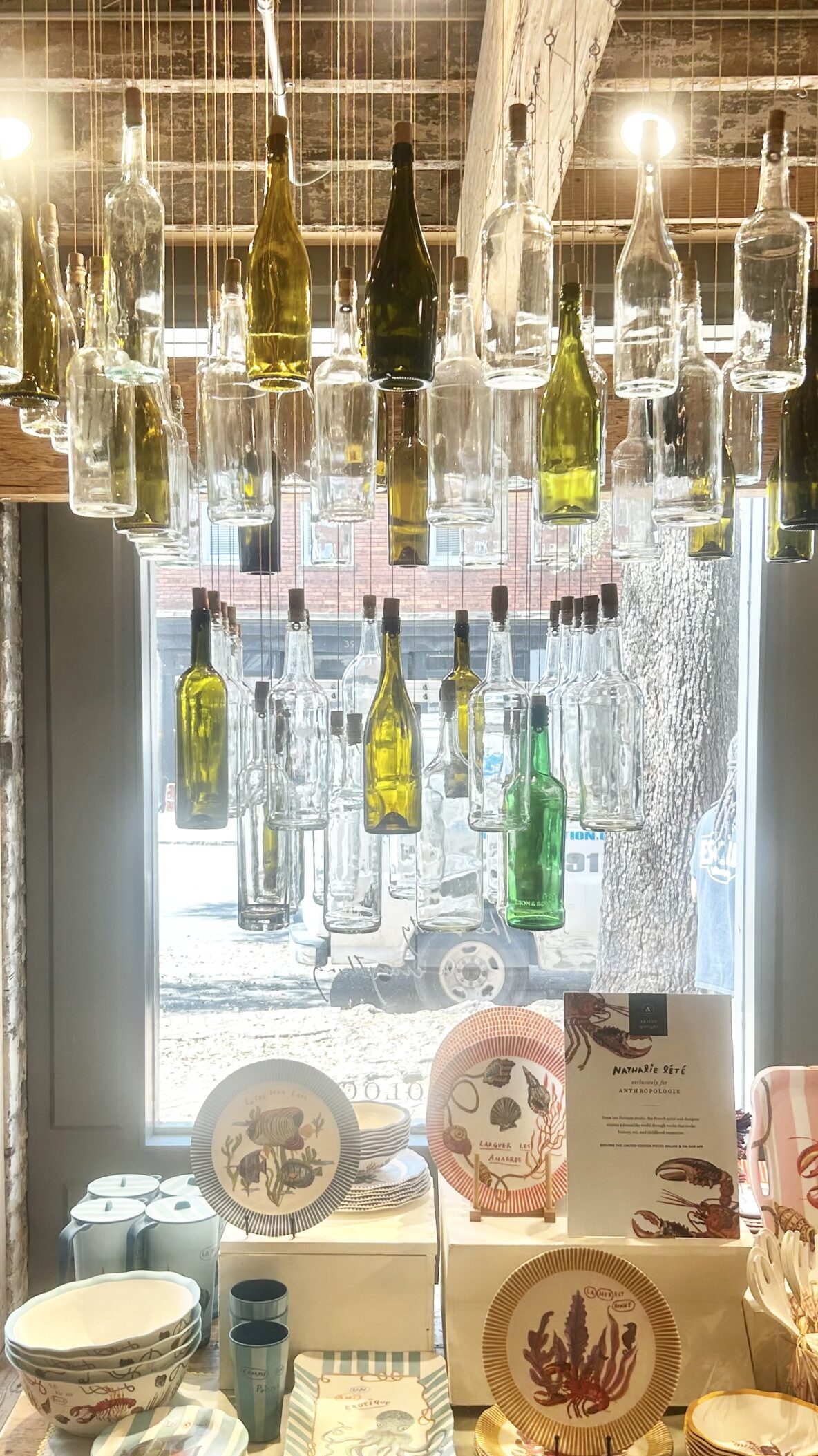 This upcycled chandelier repurposes collected wine bottles into a sculptural lighting installation that reflects the brand’s focus on sustainability and creative reuse.